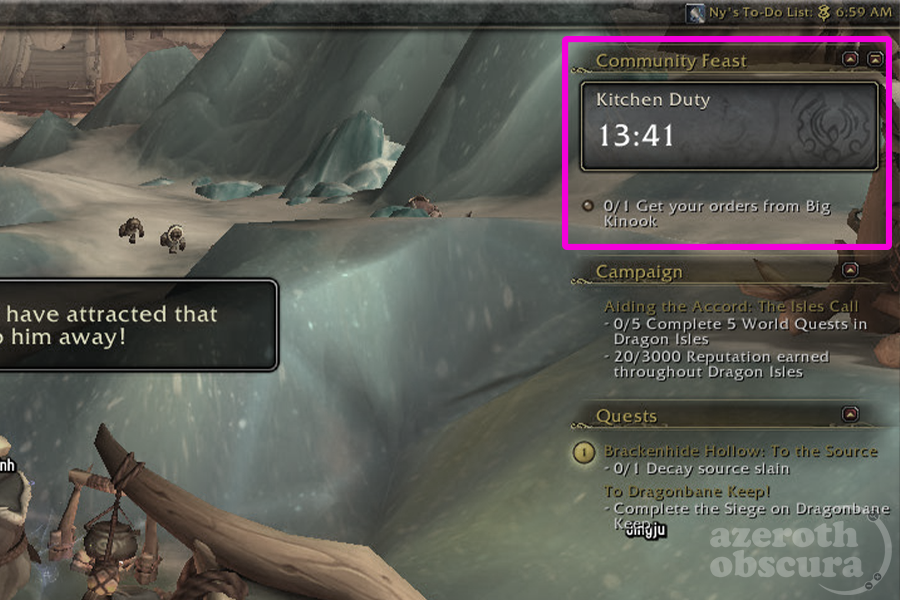 Once the feast event begins, you will have 15 minutes to complete as many of Big Chef Kinook’s tasks as possible. If many players participate, you will see a lot of ground clutter and task-related interactivity. Your actions do not count toward progress unless Big Check Kinook has specifically assigned you a task, so pay attention!